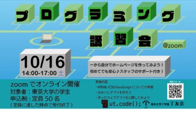 ut.code(); は工学部丁友会と合同で、東京大学の学部生および大学院生を対象にプログラミング講習会を以下の通り実施いたします。 概要 HTML・CSS...