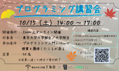 会場の様子1 会場の様子2 10/15(土) にオンライン形式で 丁友会 × ut.code(); プログラミング講習会を開催しました。 今回のイベントでは新歓体験会にあたる内容( HTML, CSS, JavaScript の基礎 )を扱い、3 時間という限られた時間の中で多くの参加者が実際におみくじアプリを作成することができました。途中の演習では、丁友会の方々を含めスタッフと参加者がブレイクアウトルームに分かれることで活発に質問が行われていました。 ut.code(); の次のイベントは駒場祭となり、たくさん体験型プログラムを用意しているので是非事前の入構予約の上ご参加ください!...
